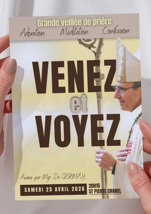 • 20h00 : « Venez et voyez » : grande veillée de prière (toujours à St P. Chanel) adoration, méditation, confession (voir affiche ci-dessous)